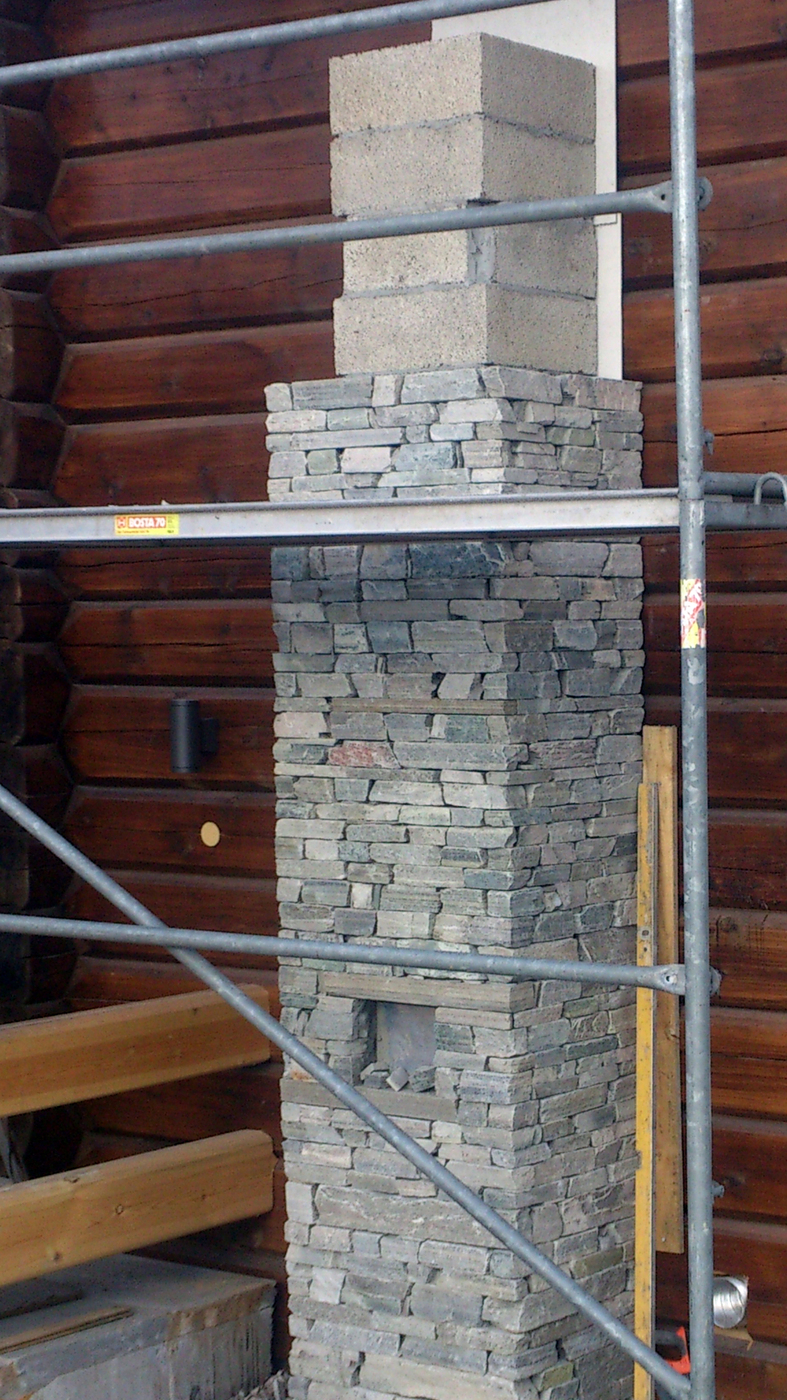 Murt peis med trestokk. Brunner peisinnsats med glasshevedør. Skrå kappe i front og side, tørrmur / råpkopp med Oppdalskifer. Peis koblet til utvendig elementpipe som også er kledd med råkopp