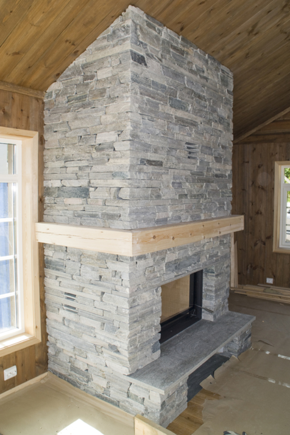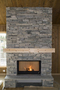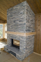 Murt peis med trestokk og vednisje. Brunner peisinnsats med glasshevedør, kledd med lys Oppdal tørrmur (råkopp), Fageråsen