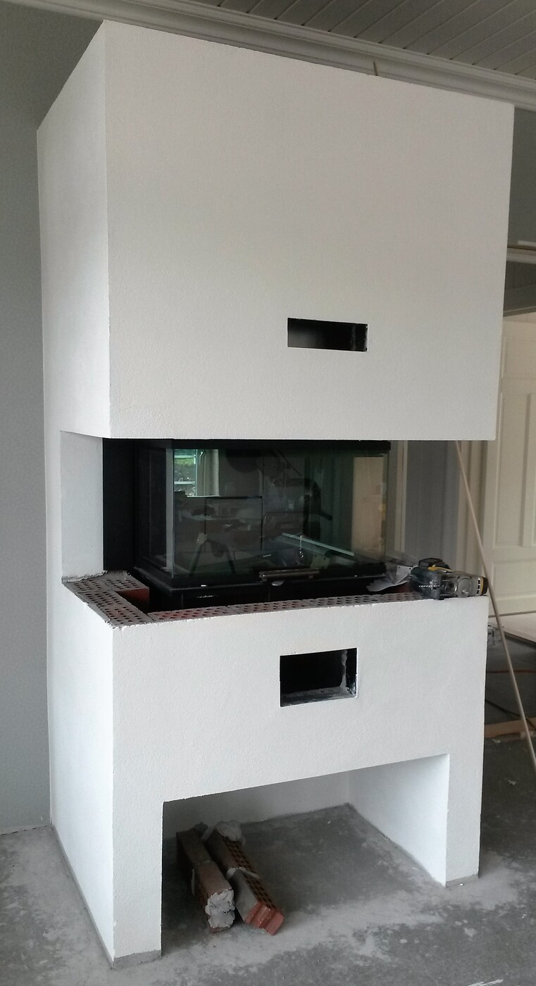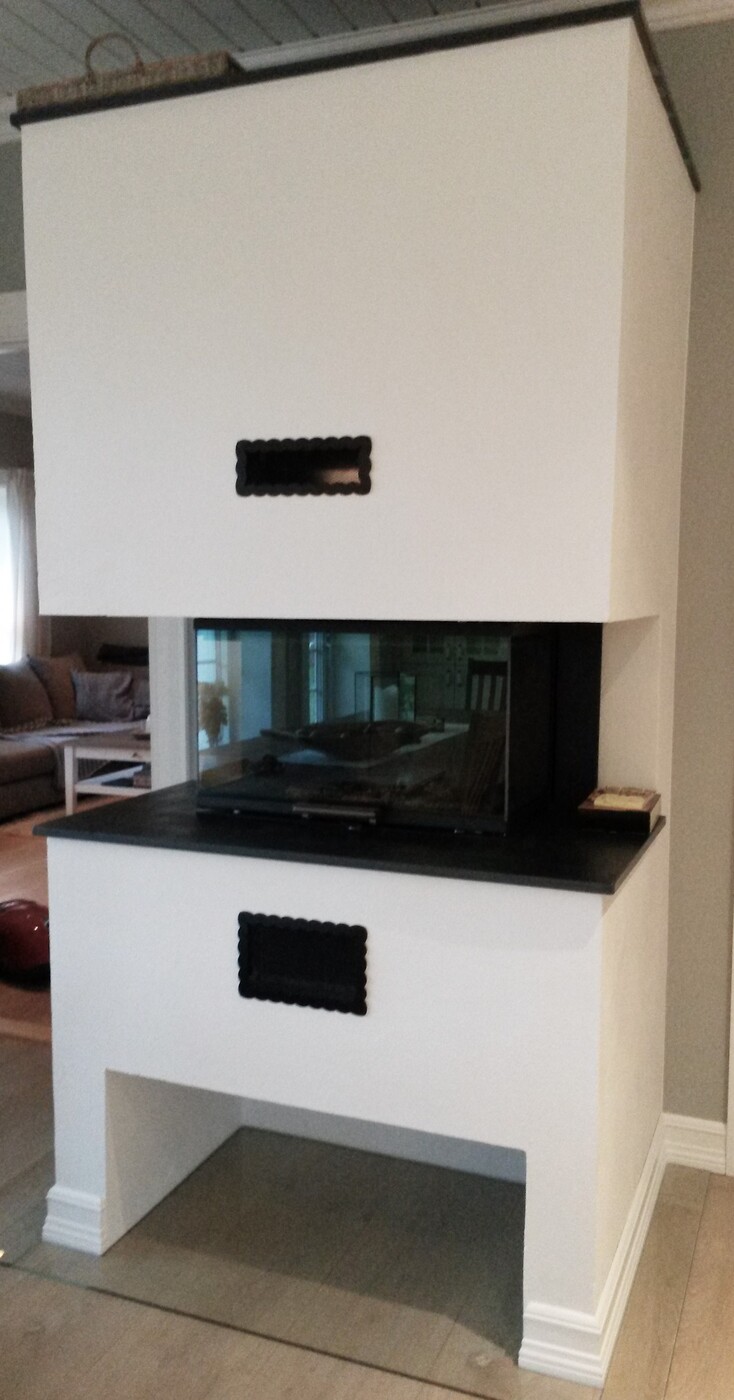 Rais Visio 3 peisinnsats med glasshevedør. Murt peis med Brasiliansk skiferplate som bord og topplate, Pusset og malt. Vednisje. Koblet til elementpipe.