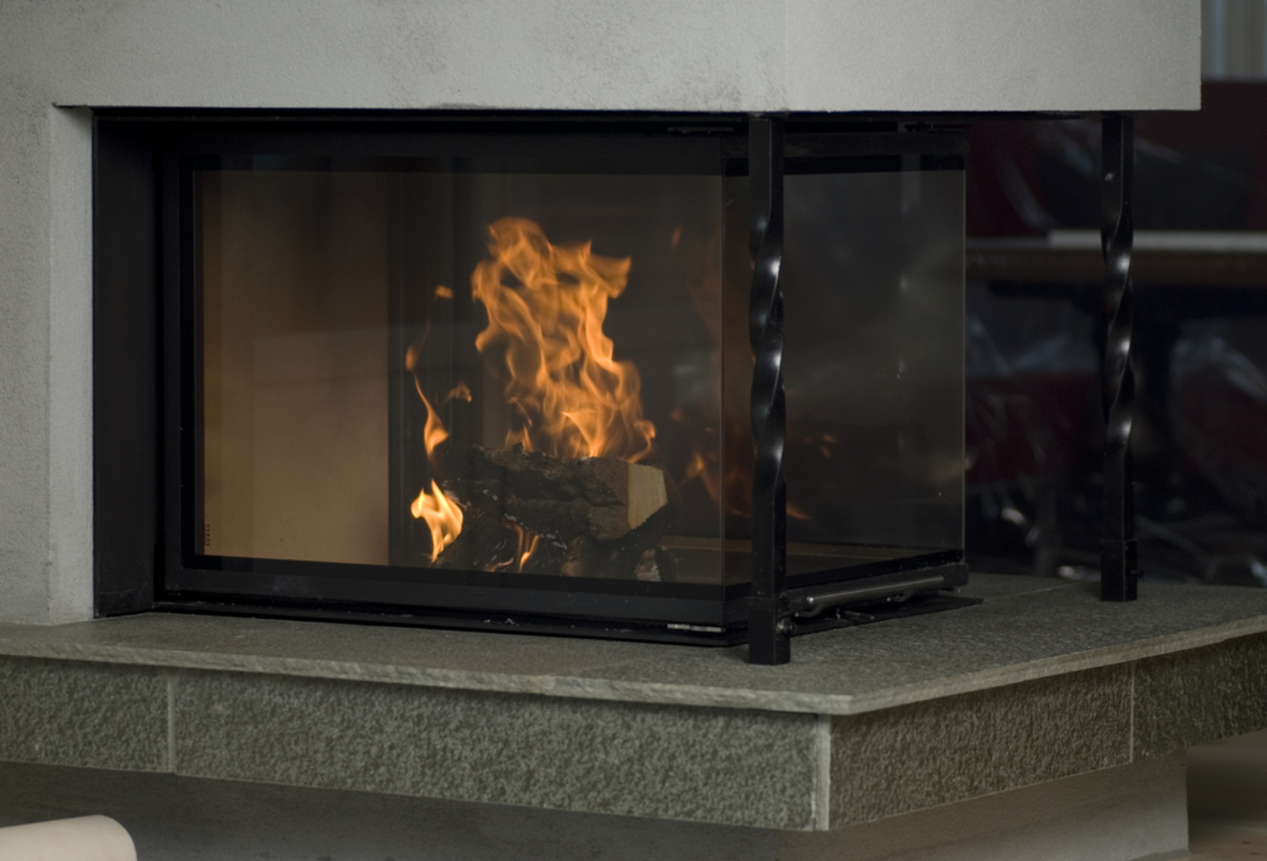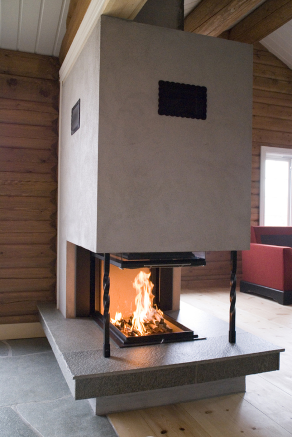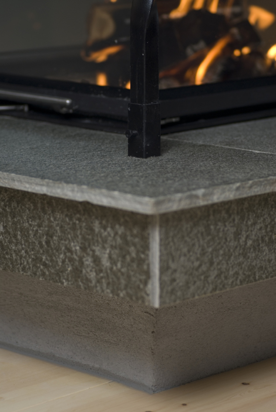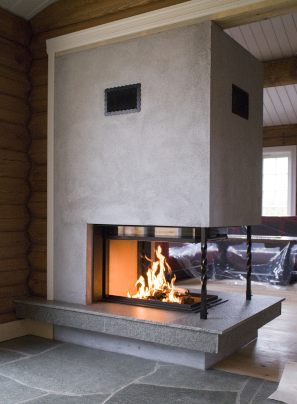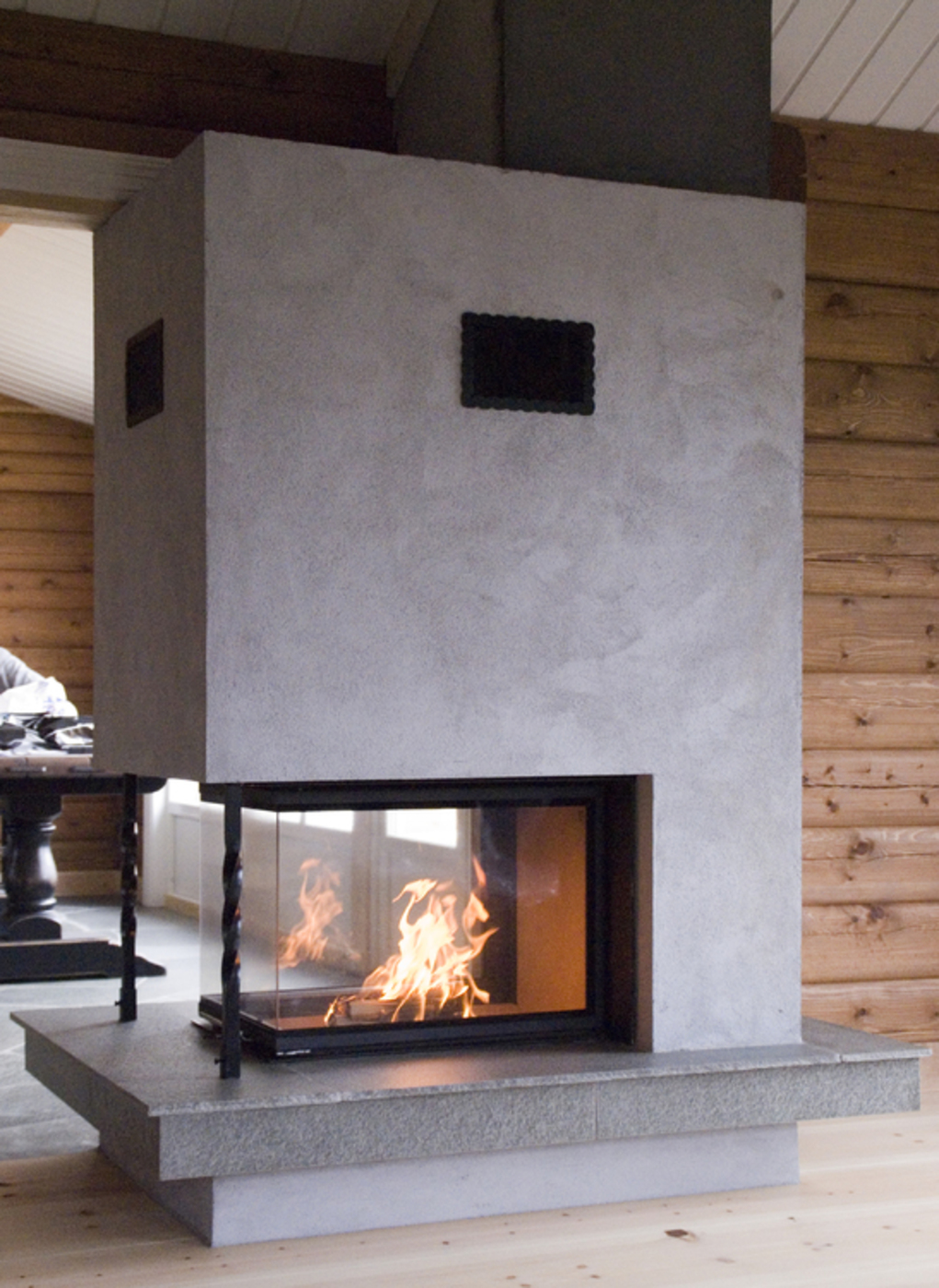 Murt peis med Brunner Panorama tresidig peisinnsats med glasshevedør, bord av Snåsaskifer, pusset. Solberglia