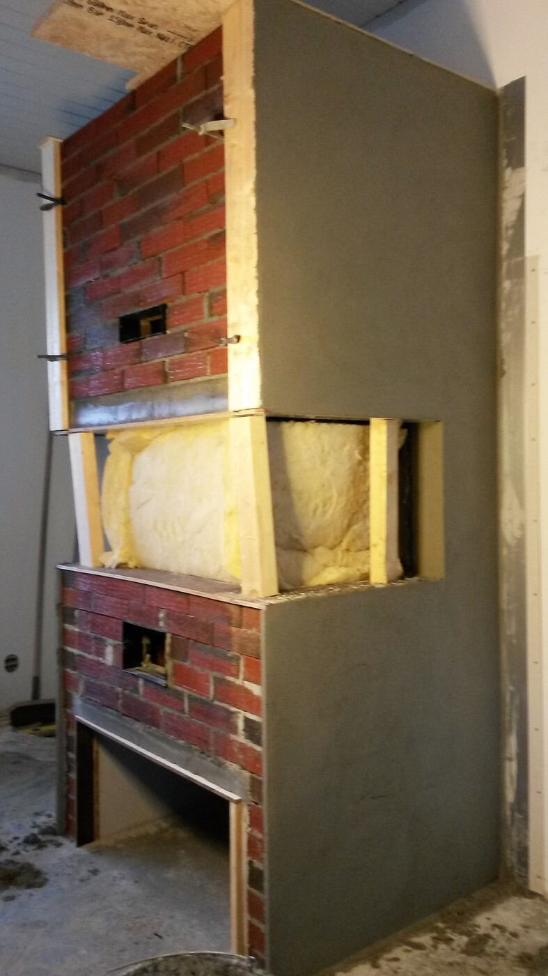 Rais Visio 3 peisinnsats med glasshevedør. Murt peis med Brasiliansk skiferplate som bord og topplate, Pusset og malt. Vednisje. Koblet til elementpipe.